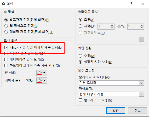 이곳에 표시옵션을 보면 "<Esc> 키를 누를 때까지 계속 실행"이라는 항목에 체크를 해하고 확인을 누르면 누군가 ESC를 누르지 않는다면 PPT는 다시 맨 앞장에서 다시 시작하게 된다.
